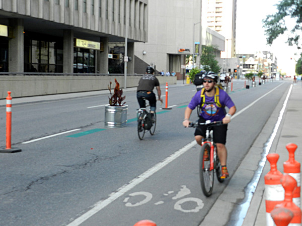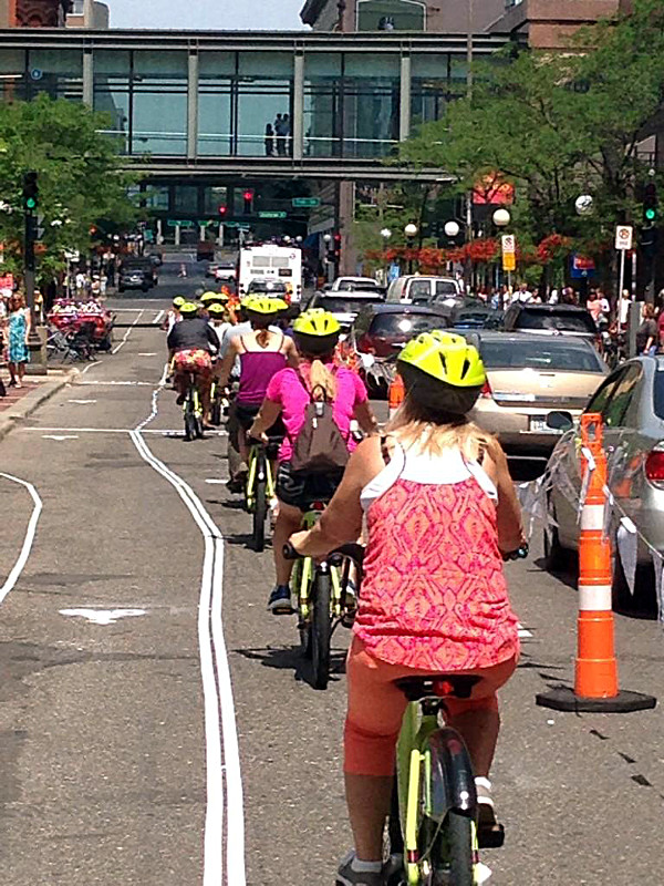 “Many people ignored the lane and stayed on the street,” wrote Alyssa Gullekson of the Dakota Medical Foundation in an email about a July 15 pop-up in Fargo, N.D. “At the next event in August, we will route bicycles into the lane so that that is the route is assumed most appropriate. We will also have an individual directing people into lane to draw more attention to it.”