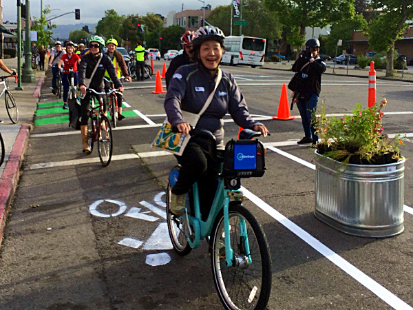 That’s Oakland Mayor Jean Quan having a great time riding a bike share bike in a protected bike lane.