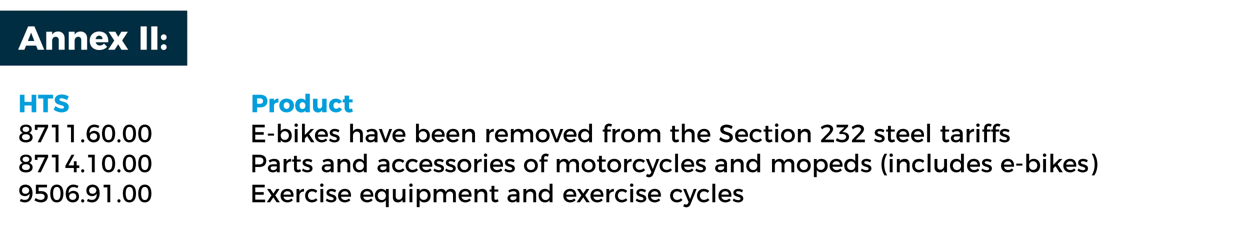The president also determined, based on information and advice from the Secretary of Commerce, that certain products listed on Annex II should be removed from the list of derivative products previously added to the Section 232 tariffs. Products of relevance to the bike industry include: