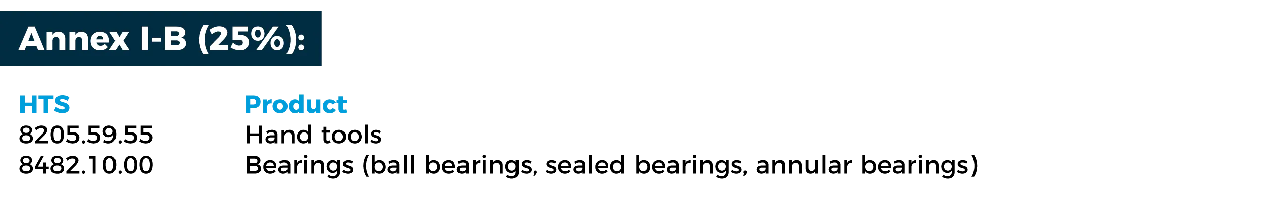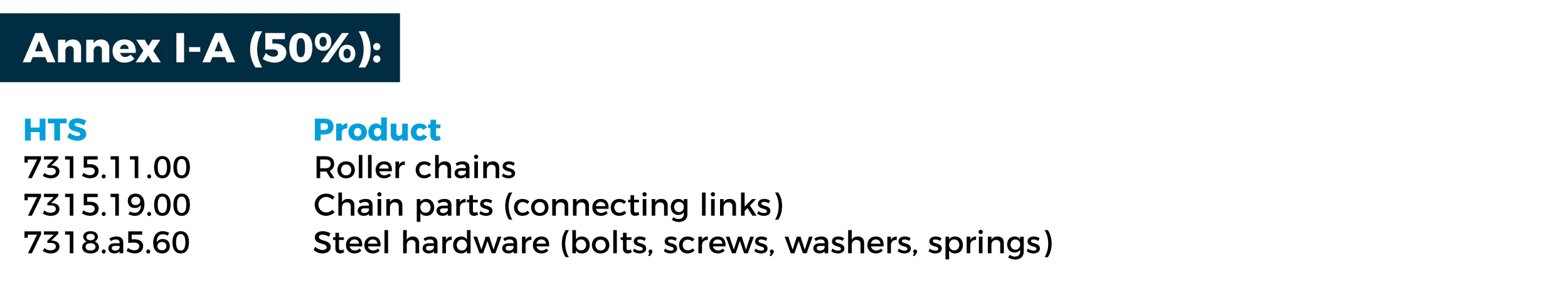 Derivative products listed in Annex I-A and I-B will be subject to either a 50% tariff (Annex I-A) or a 25% tariff (Annex I-B). There are some exceptions for products from the UK or other trading partners that have reached or will reach a reciprocal trade agreement with the United States and are made with U.S.-origin metal or metal sourced in that country. Manufacturers should review these annexes and consult with their customs brokers or trade counsel to determine whether their imported products remain subject to applicable Section 232 tariff rates. Products of obvious relevance to the bicycle industry include: