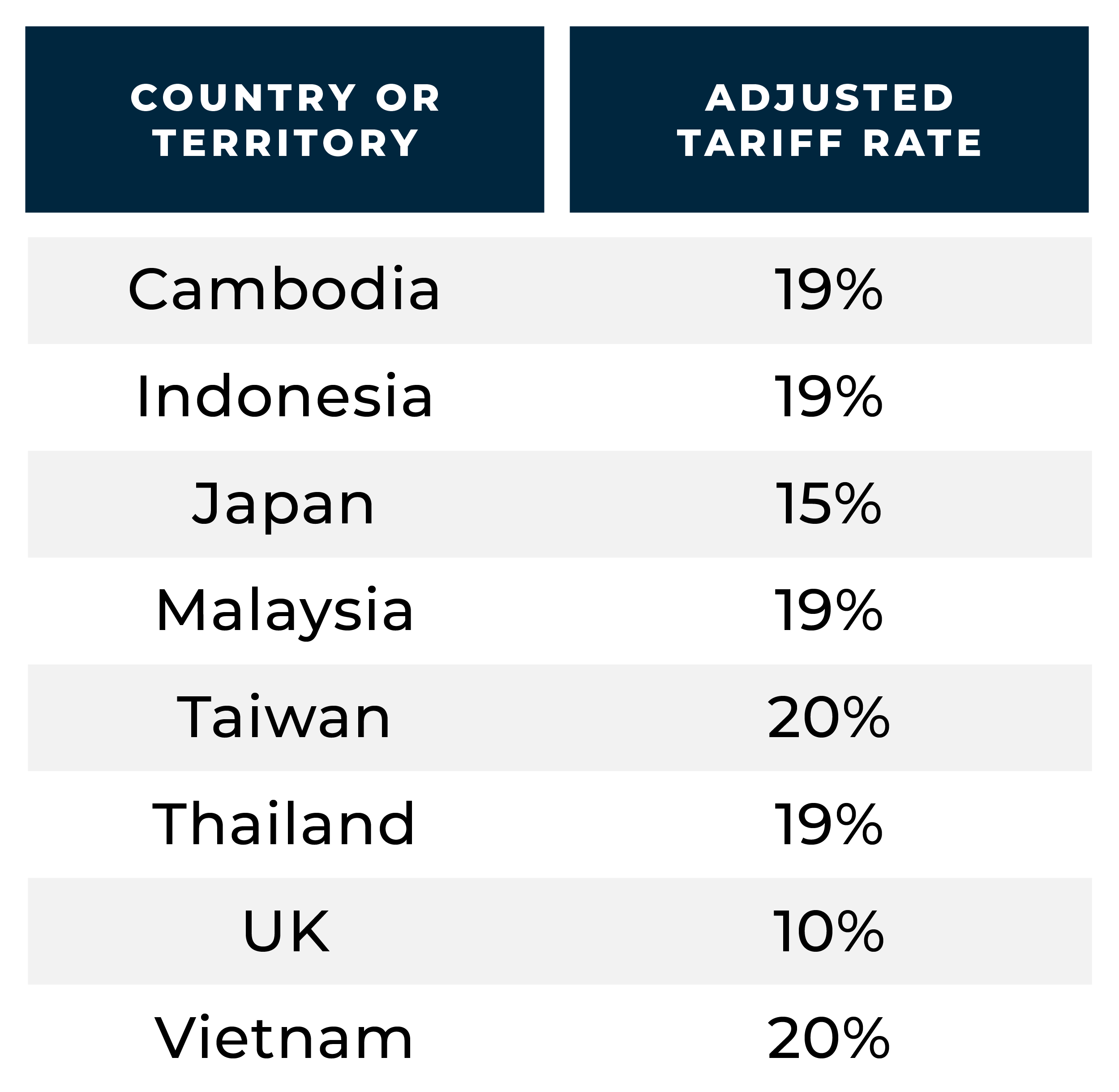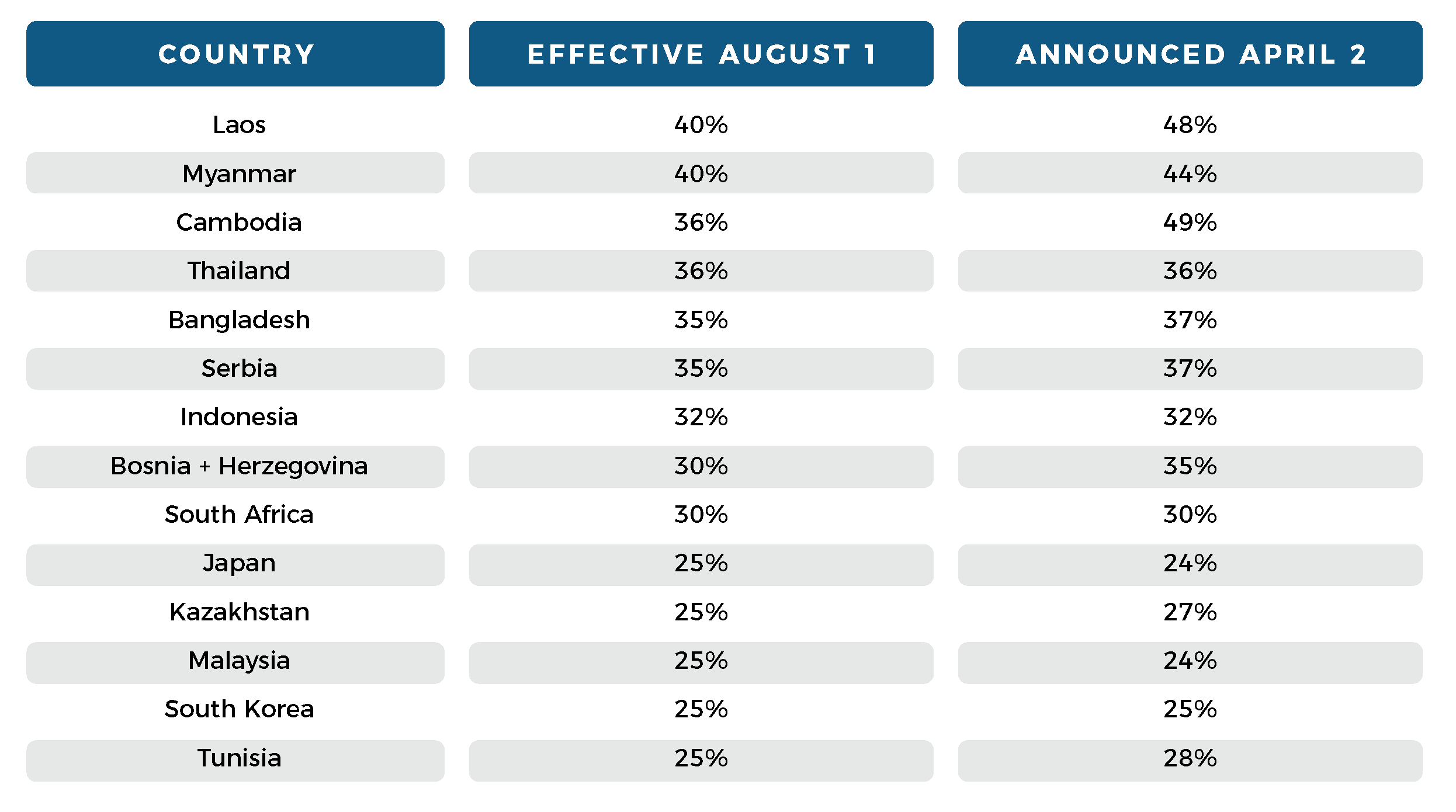 On July 7, the White House announced the "90-day pause" on reciprocal tariffs due to expire on July 9 is now extended until August 1. However, the administration began to notify countries (by letter) of new tariff rates for products imported into the United States, listed below.