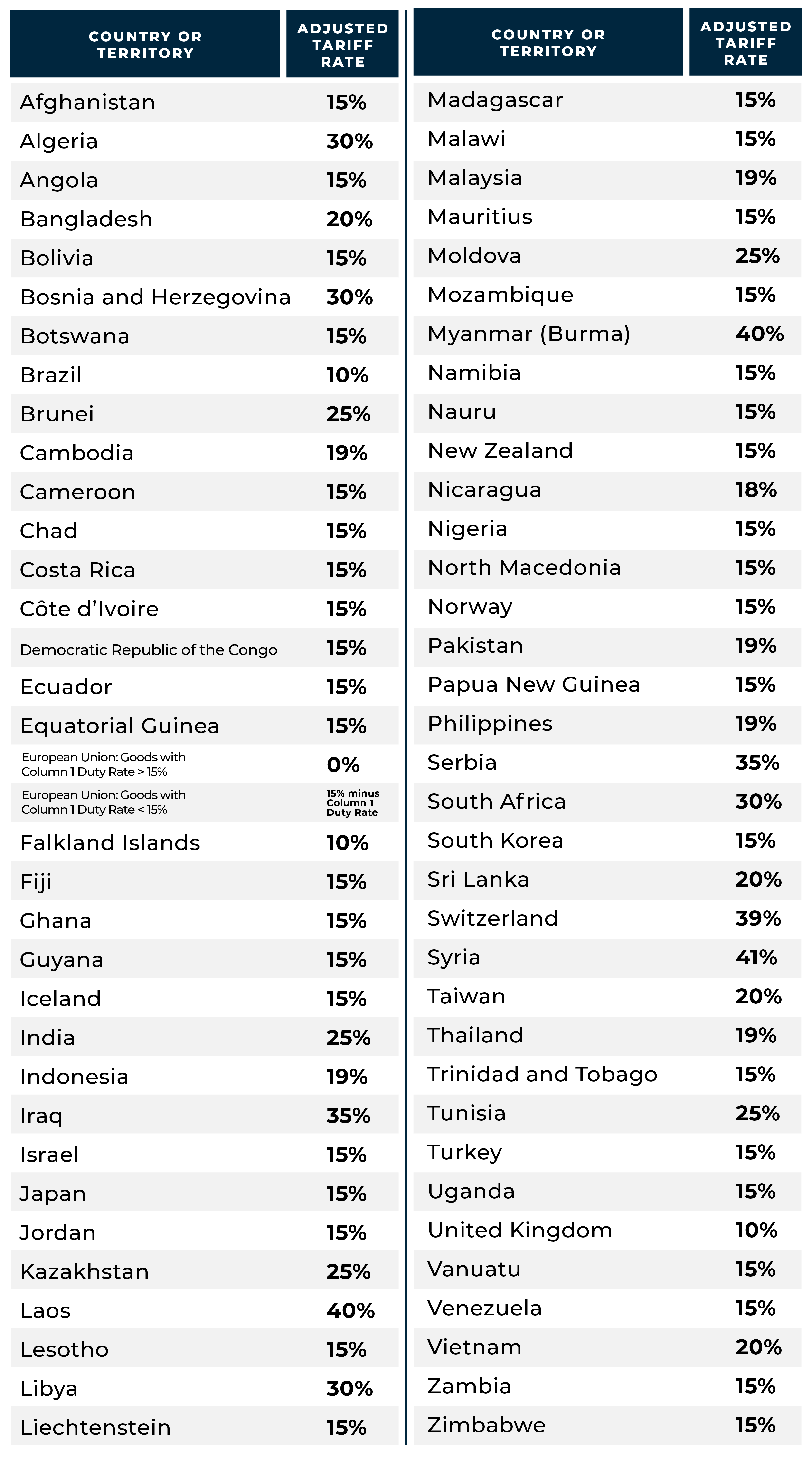 A list of countries targeted for specific new tariff rates and the applicable rates are listed in Annex I of the executive order. The additional 10% tariffs will go into effect on April 5 at 12:01 a.m. EDT for all countries and the new targeted base tariffs will take effect on April 9 at 12:01 a.m. EDT. Neither tariff will apply to goods loaded onto a vessel at the port of loading and in transit on the final mode of transit prior to the respective effective date/time.