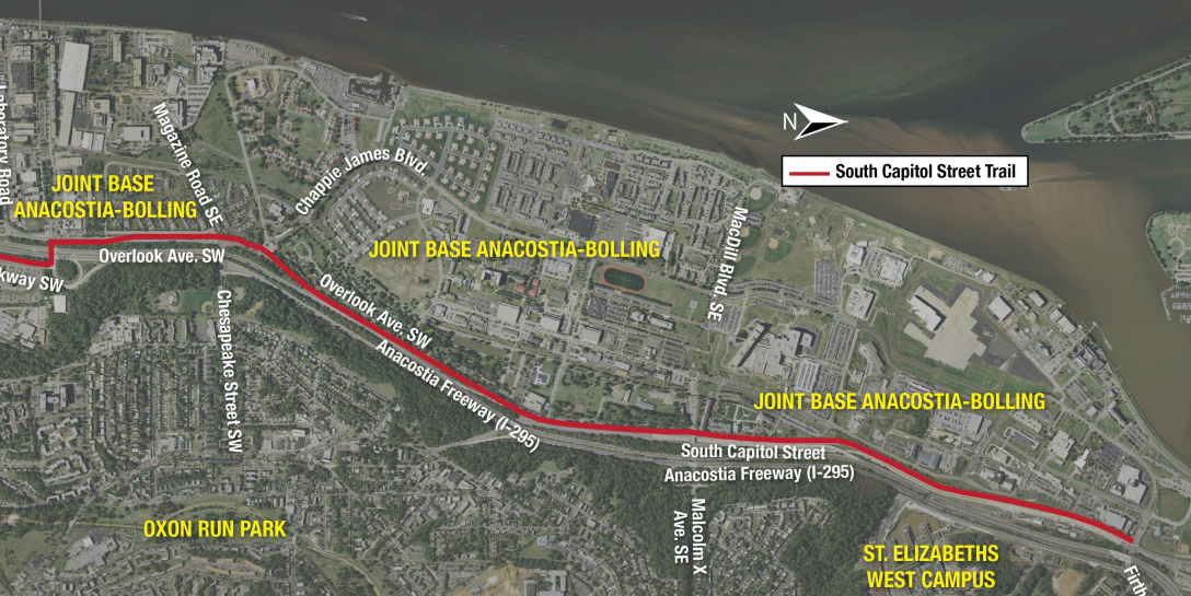 Washington, DC’s $10 million RAISE award for the South Capitol Street Trail project will be used to construct a 3.8-mile-long extension of the Anacostia Riverwalk Trail network. (Image credit: Anacostia Waterfront Initiative)
