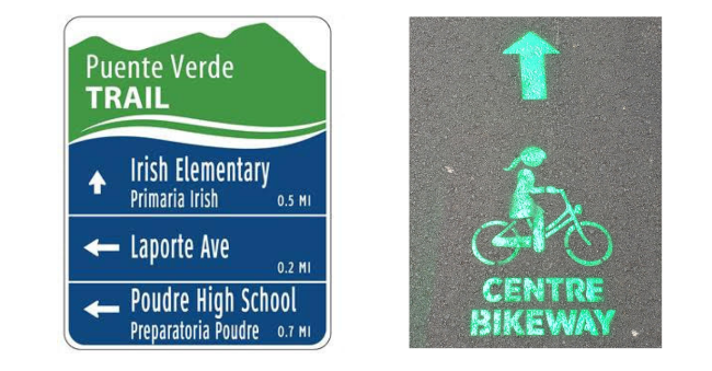 Left: An example of one of the permanent signs installed by the city of Fort Collins, complete with Spanish translation. Right: One of the city’s temporary wayfinding signs, created using a stencil and water-based paint.