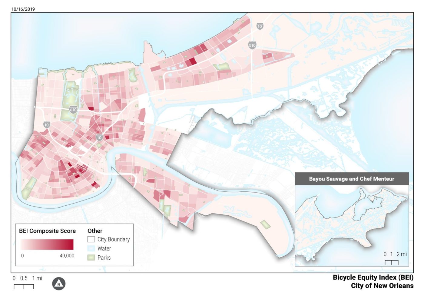 At the end of 2019, Toole Design was brought in to collaborate with New Orleans on its bike plan, helping with all facets of the process, from the initial network analysis to the design of low-stress, separated bike lanes. Included in its scope of work was an equity analysis, which ultimately became one of the guiding principles of the plan alongside such factors as whether or not potential routes addressed connectivity, were useful or could be built in a timely manner. Using the League’s BEI as a starting point, New Orleans was keen on creating its own index.