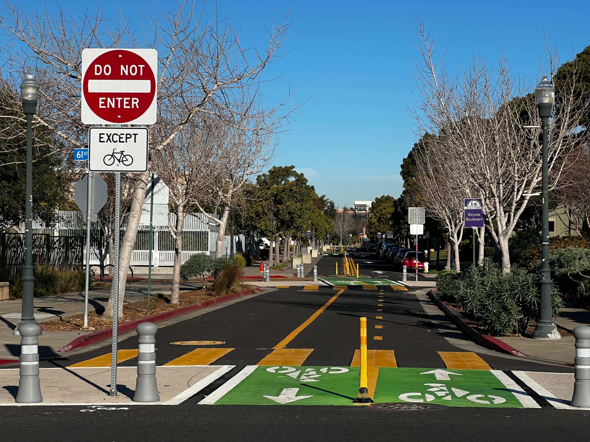 A shot of Doyle Street in Emeryville, California, where a pandemic quick-build was made permanent.