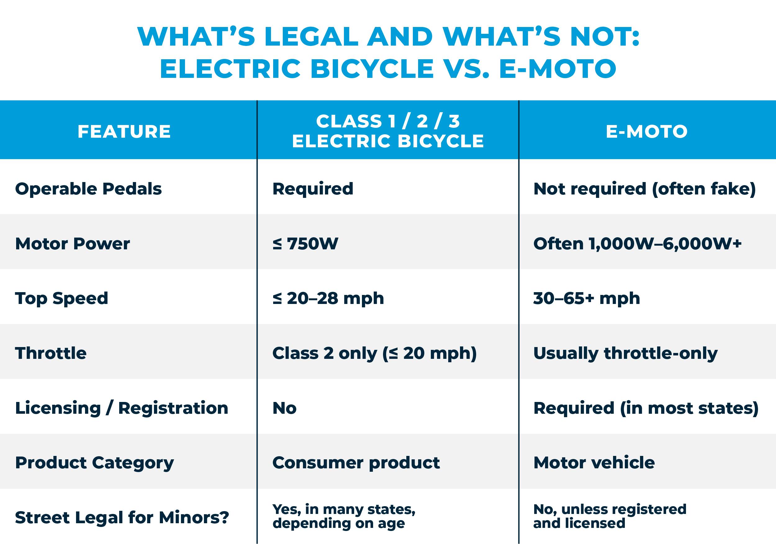 Isn’t Anything With Pedals An Electric Bicycle? No. E-motos are often equipped with pedals from the manufacturer or have pedals added by consumers in an attempt to disguise the e-moto as an electric bicycle and “fly under the radar.” While operable pedals are required for a vehicle to be an electric bicycle, the mere presence of pedals on an overpowered or excessively fast e-moto does not make it a “legal” electric bicycle. Any vehicle with an electric motor in excess of 750 watts or that can travel over 20 miles per hour when powered only by the motor is not an electric bicycle, even if it has pedals and the manufacturer claims it is “street legal.”