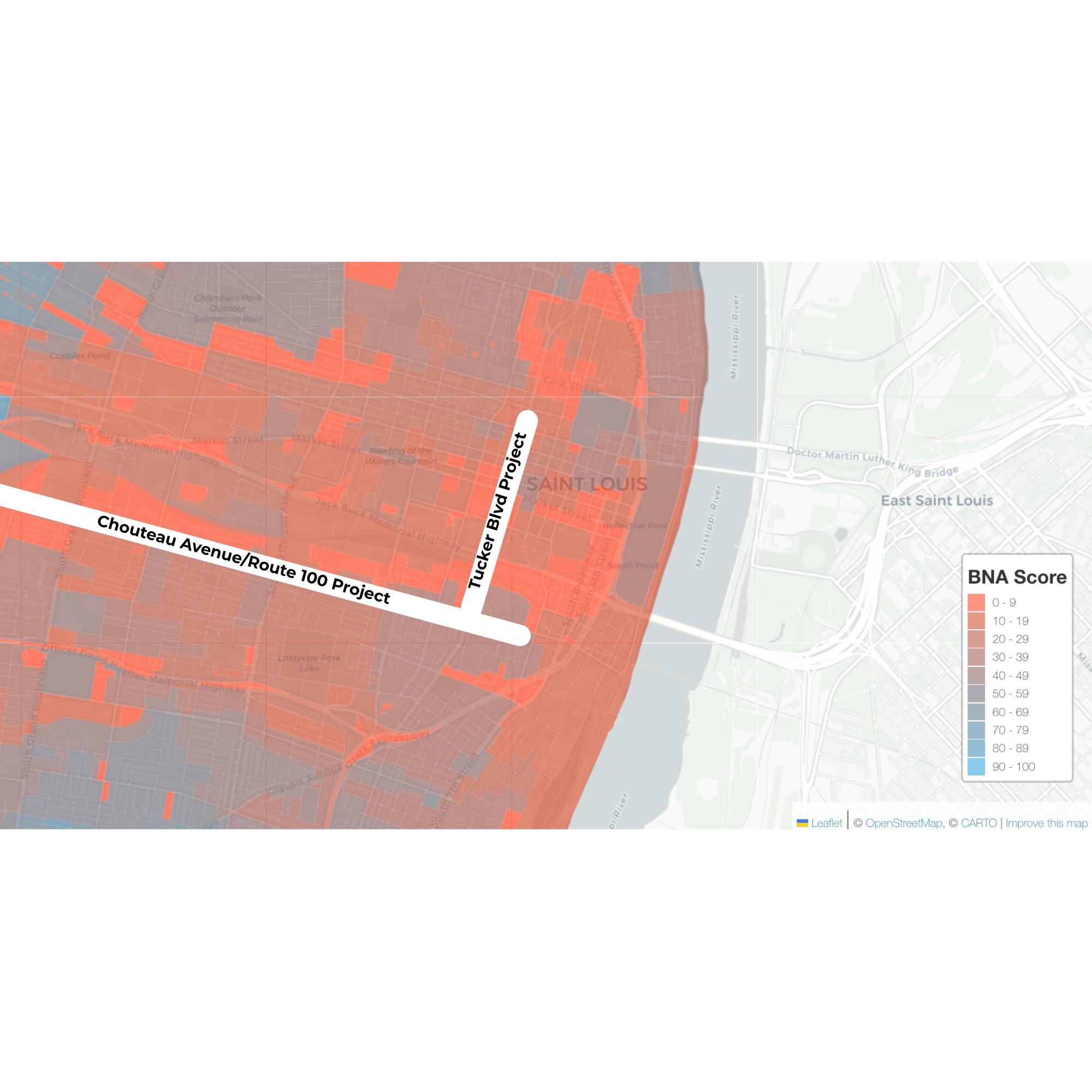 Projects like Tucker Boulevard play an important role in expanding and connecting St. Louis’s low-stress bike network. Progress in St. Louis and thousands of other communities is tracked through PeopleForBikes’ Bicycle Network Analysis (BNA), the data tool that powers our City Ratings program and measures how easy it is for people to get where they need to go by bike.