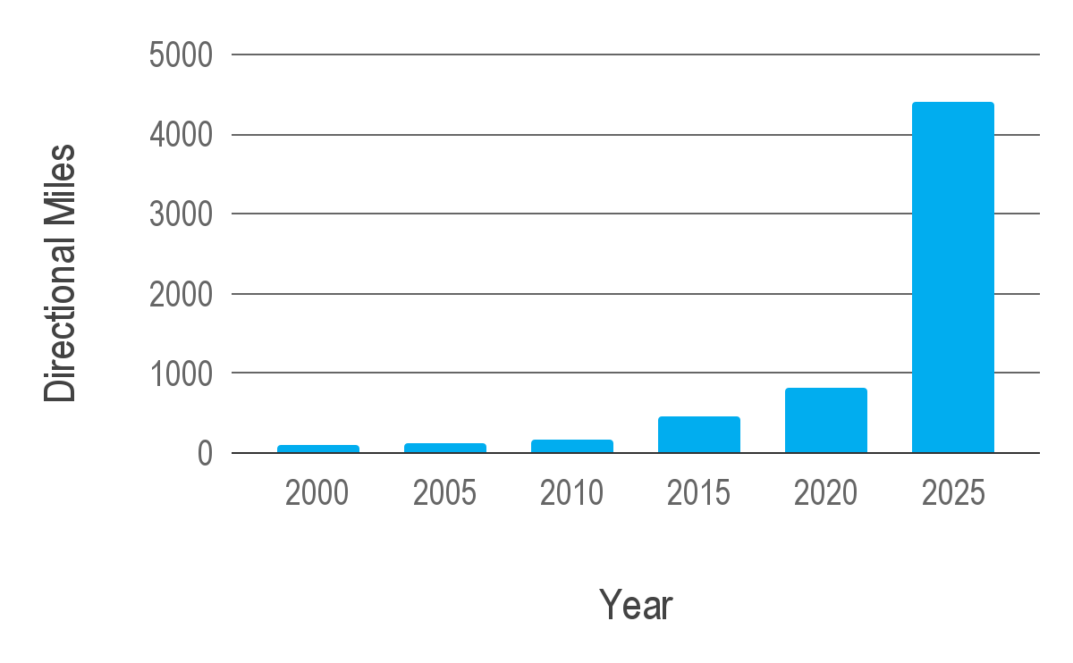 In 2000, there were an estimated 108 directional miles of protected bike lanes in the United States. In 2020, the miles of U.S. protected bike lanes grew to about 800. By 2025, that number was estimated to have grown to approximately 4,400. Directional mileage measures bikeways by direction of travel. If protected bike lanes run on both sides of a street, or if a bi-directional protected lane exists on one side, each direction is counted separately and summed to produce the total mileage.