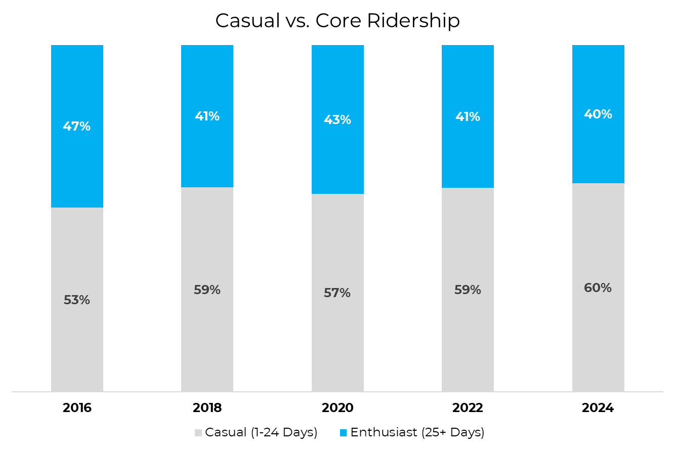 That growth is being driven by casual riders — people who ride twice a month or less. In 2016, these casual riders accounted for 53% of the participant base. In 2024, that grew to 60%. Though the pie is getting bigger, the enthusiasts who ride often and invest in mid- to high-end bikes, apparel, and gear aren’t necessarily growing with it.